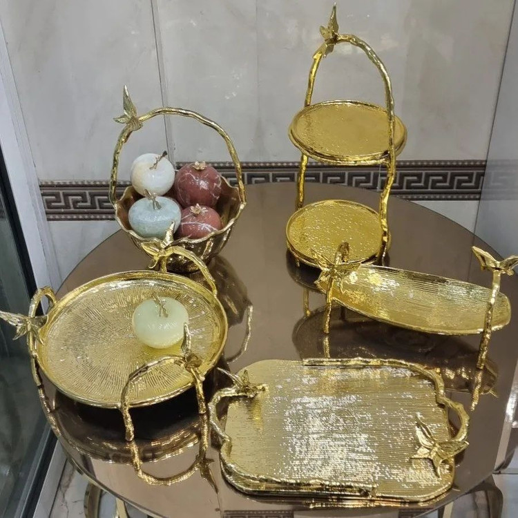 سرویس پذیرایی پروانه ایوان آلومینیوم طلایی و نقره ای براق شامل: میوه خوری آجیل خوری شیرنی خوری دو طبقه کشکول سینی مستطیل